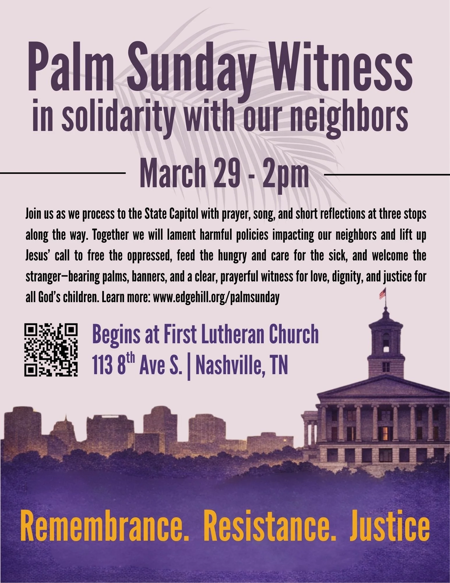 Join us in downtown Nashville on Sunday, March 29 at 2:00 p.m as we gather at First Lutheran Church and process together to the State Capitol. With palms in hand, clergy in purple stoles, banners raised, and songs and prayers on our lips, we will offer a serious, prayerful, and determined witness.